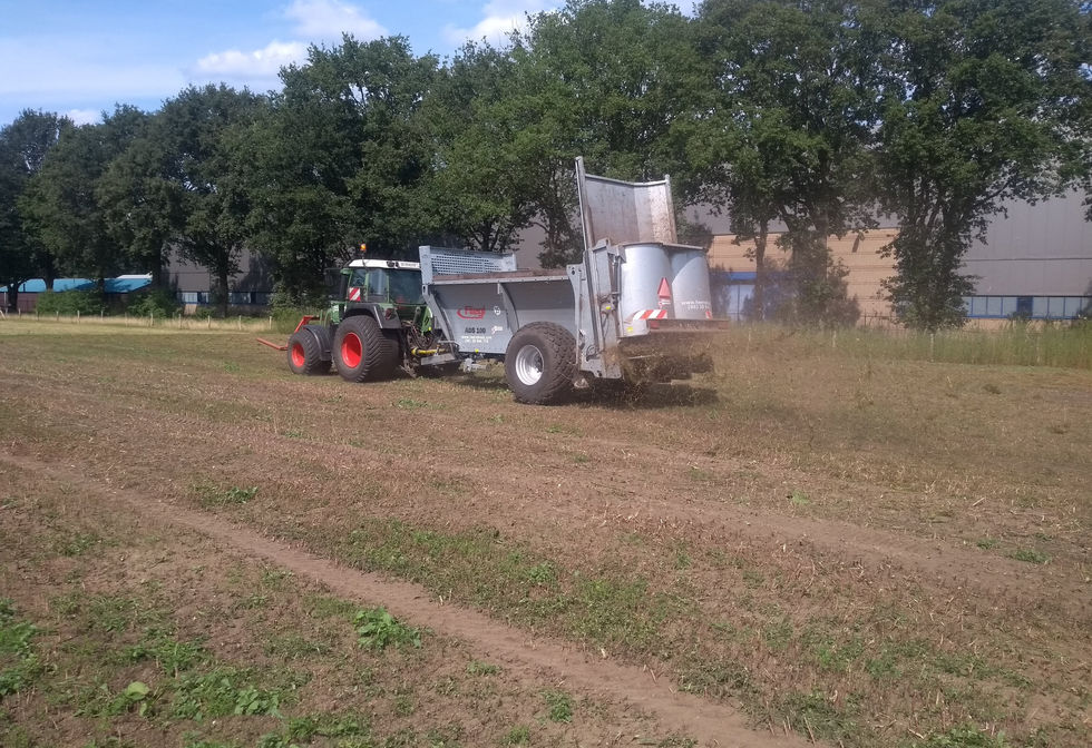 Door gemaaid gras uit te strooien over percelen kan het zaad dat in het gras zit op het gestrooide percelen uitkomen. De strooier beschikt over brede ballonbanden waardoor niet zichtbaar is waar er gereden is.zichtbaar is waar er gereden